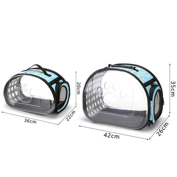 Give your furry friend a first-class travel experience with this Large Blue Pet Transparent Space Capsule Outing Package. This innovative pet carrier offers a 360-degree panoramic view, ensuring your cat or dog enjoys maximum visibility and ventilation during their travels. Crafted from durable PVC, this carrier features three-sided ventilation holes and a convenient zippered side door for easy entry and exit. The non-slip base keeps the carrier stable and isolates it from dust, while the high-quality metal zipper ensures smooth operation. This spacious carrier is suitable for pets up to 7.5kg and folds flat for easy storage. Carry it comfortably with the included shoulder strap. Dimensions: 42 x 26 x 35cm (when open), 42 x 7 x 35cm (folded). Weight: Approximately 900g.