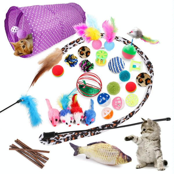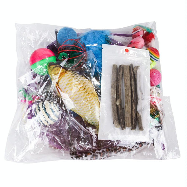 Keep your cat entertained for hours with this 28-in-1 cat toy set. Packed with a variety of stimulating toys, this bundle includes feather mice, colourful balls, plush toys, a sisal ball, and more. Made with safe and durable materials, these toys are designed for extended play. This comprehensive set offers excellent value, providing everything your feline friend needs for chasing, batting, pouncing, and cuddling.