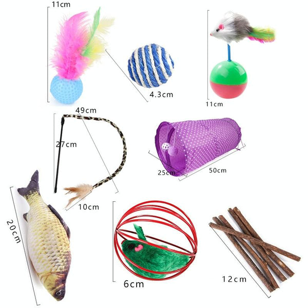 - Includes feather wands, plush mice, balls, and a sisal ball for scratching