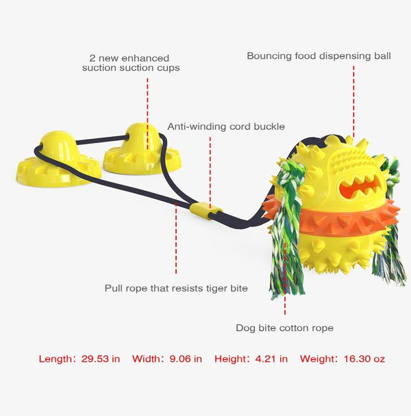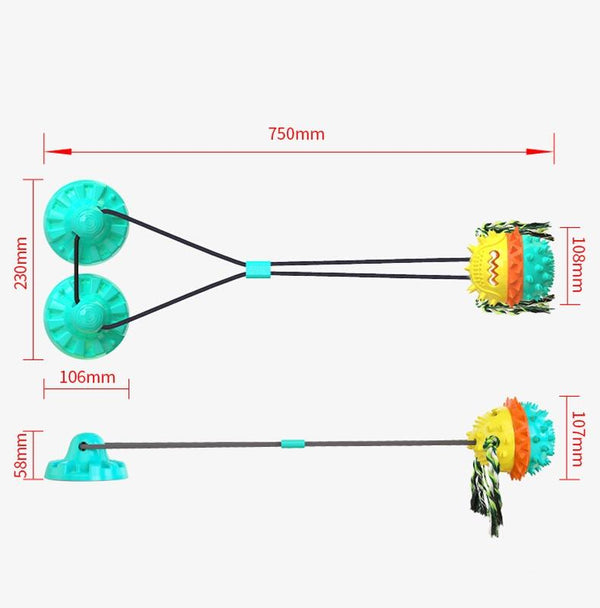 Featuring a powerful double suction cup design with included floor stickers, this toy stays securely in place on smooth or rough surfaces, indoors or outdoors. Simply stick the floor stickers to your chosen surface, attach the suction cup, and watch your dog enjoy hours of interactive fun. The added bounce rope and molar ball provide extra stimulation and exercise.