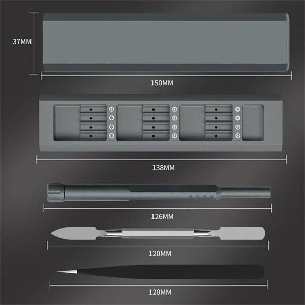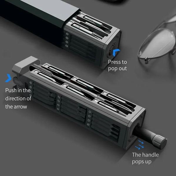 Tackle any repair task with this comprehensive 44-in-1 Precision Screwdriver Set. Featuring a convenient push-type magazine design for quick bit changes and a magnetic groove to securely hold screws, this kit is perfect for a wide range of applications. The S2 alloy steel bits provide exceptional durability and precision, making them ideal for electronics repair, including smartphones, tablets, laptops, glasses, watches, and other delicate devices. The ergonomic aluminium alloy handle offers a comfortable grip for extended use. This magnetic screwdriver set includes 44 different bit sizes to ensure you have the right tool for the job, covering Phillips, Flathead, Torx, Pentalobe, and more. Upgrade your toolkit with this versatile and durable precision screwdriver set.