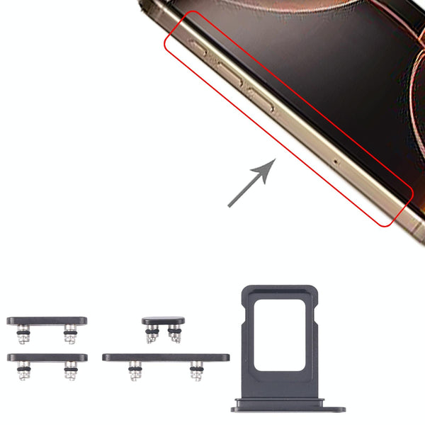 Search terms: iphone 16 pro max, sim tray, sim card tray, side keys, volume buttons, power button, mute switch, replacement part, repair, black, dual sim
