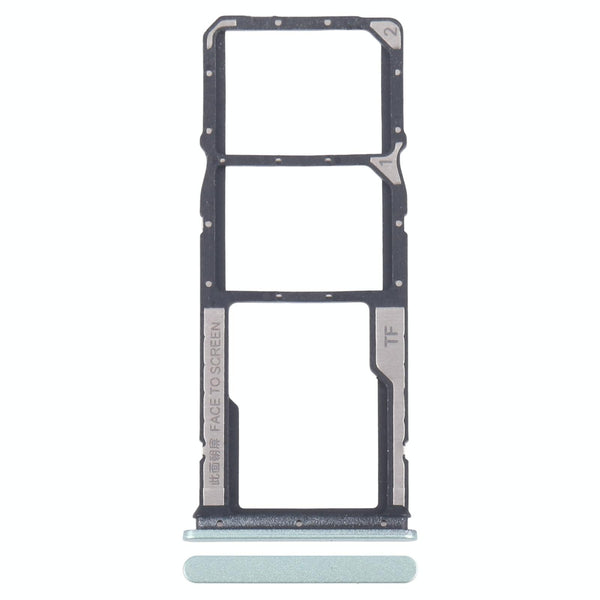 Search terms: Xiaomi Redmi 13R, SIM tray, SD card tray, SIM card holder, SD card holder, dual SIM, green SIM tray, replacement part, Redmi 13R repair, mobile phone repair, memory card tray.
