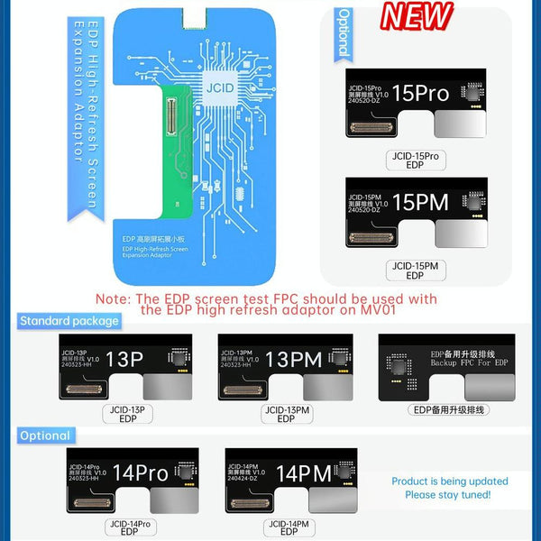 Diagnose iPhone and iPad high refresh rate screen issues with the JCID EDP Adapter. This innovative tool allows for real-time touch testing and display diagnostics on 120Hz ProMotion displays, providing a tangible, accurate assessment of screen functionality. Compatible with JCID V1S Pro and MV01 programmers, the EDP adapter eliminates the need to replace the host device during testing. See the touch track directly displayed on the high refresh screen, offering a clear visualisation of touch input. This industry-first solution goes beyond basic display testing, providing a comprehensive and efficient way to troubleshoot and repair iPhone 13 Pro/13 Pro Max/14 Pro/14 Pro Max/15 Pro/15 Pro Max and compatible iPad models with ProMotion technology.