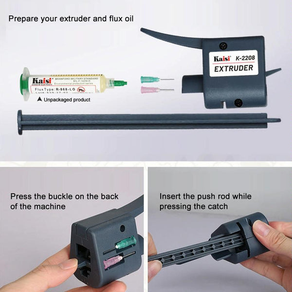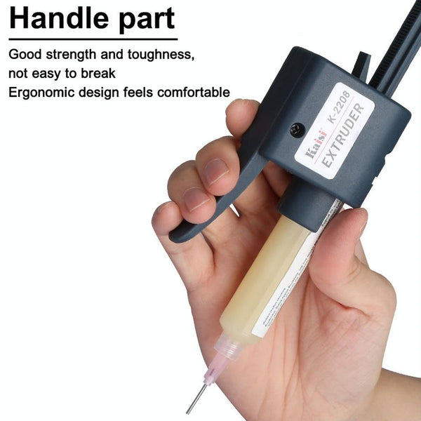 Precisely apply adhesives, solder paste, UV solder mask, and structural glues with the Kaisi K-2208 Manual Glue Gun. This 10cc syringe applicator offers smooth, even dispensing, saving you time and effort. Its ergonomic design ensures a comfortable grip for fatigue-free operation, even during extended use. The K-2208's robust, industrial-grade construction guarantees durability and long-lasting performance. Two different sized needles are included for various application needs, providing flexibility and precision. Benefit from fast, efficient, and controlled glue dispensing with this lightweight and portable tool. Ideal for electronics repair, DIY projects, and industrial applications.
