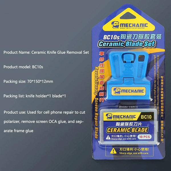 Effortlessly remove OCA glue during screen repairs with the Ceramic Blade Set BC10s. This set includes ten durable zirconia ceramic blades and a convenient holder, perfect for precision work. Unlike traditional steel blades, these rust-resistant ceramic blades offer exceptional longevity, sharpness, and safety. They are chemically inert, boasting high corrosion resistance and the ability to withstand temperatures up to 1700 degrees without heat conduction. Ideal for cutting polarizer film and removing OCA glue from mobile phone screens, the BC10s kit is an essential tool for any repair technician. Upgrade your repair toolkit today with this high-performance ceramic blade set.