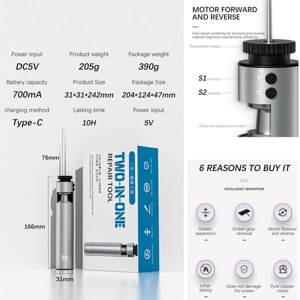 Designed for ease of use, the TBK 002 features a Type-C charging port and a compact, ergonomic design (3.1 x 3.1 x 24.2cm). Its brushless high-speed motor delivers powerful, low-noise operation, while the one-touch forward and reverse switch enhances maintenance efficiency. The TBK 002 can also be used as a screen separator and works seamlessly with heating separators for even easier and safer screen removal.