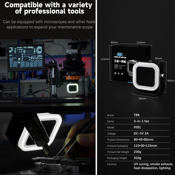 Upgrade your workspace with the TBK F001, a powerful 3-in-1 fume extractor, UV curing lamp, and cooling fan. Featuring a high-speed 15,000 RPM brushless motor, this multi-functional tool enhances efficiency and protects your health. The professional-grade dual UV lamp beads ensure rapid and effective curing of adhesives, while the three-speed adjustable fan provides targeted cooling and fume extraction. A built-in activated carbon filter effectively absorbs harmful gases, creating a cleaner and safer working environment. Compatible with various professional tools, including microscopes, the TBK F001 is a versatile addition to any repair or maintenance setup. Benefit from improved air quality, faster curing times, and enhanced precision with this essential all-in-one solution.