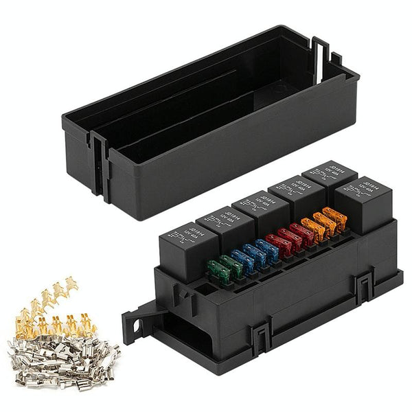 2. 12V waterproof blade fuse relay kit, 1 fuse relay holder with upper and lower covers, 6 relays, 5 pins, 11 blade fuses (ATC, ATO), 52 metal crimp terminals