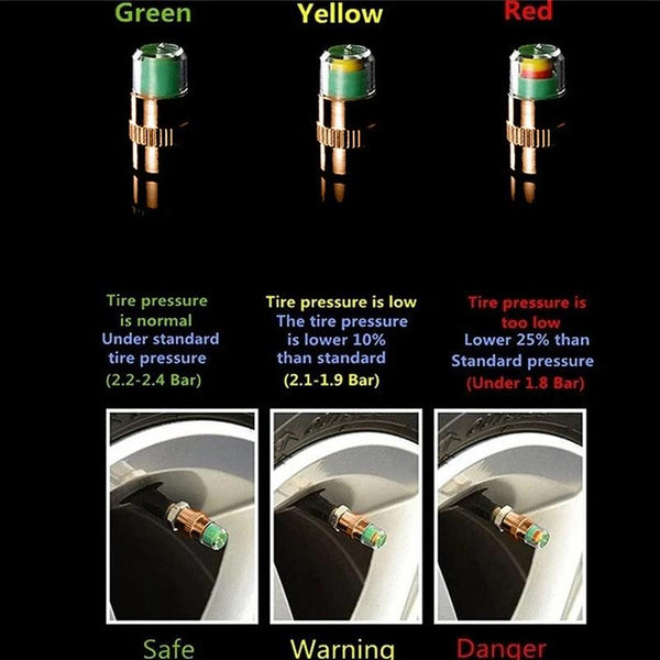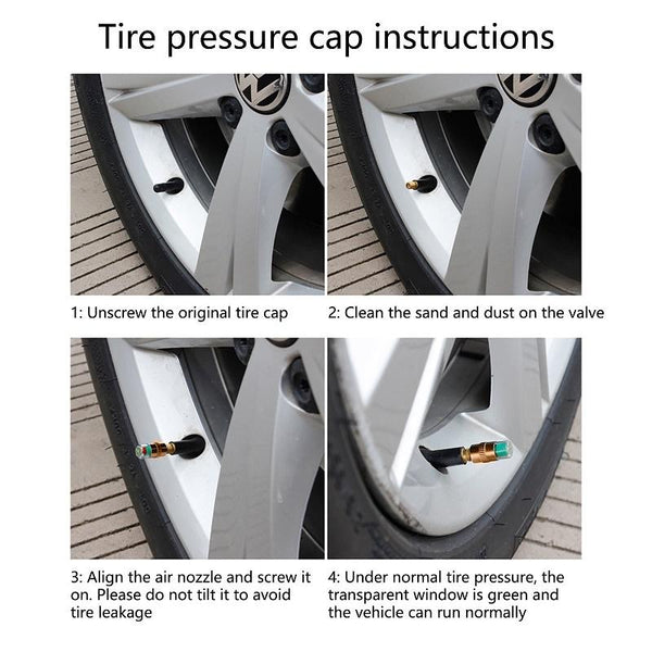 3. Product features: The tire pressure warning cap is an auxiliary tool for measuring tire pressure. It locks the tire pressure cap on the tire valve and directly displays the color change in the transparent cover.