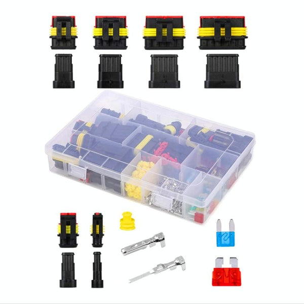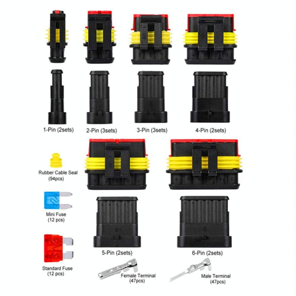 1. 1 Pin, 2 Pin, 3 Pin, 4 Pin, 5 Pin and 6 Pin Ultra Sealed Waterproof Wire Connector Kit with Standard and Micro Blade Fuses.