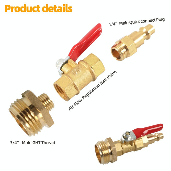3. The size of threaded connection: this winterize blowout adapter is standard threaded connection in most cases, with a 1/4 inch male air compressor quick plug to a male 3/4 inch garden hose inner thread, easy attach air line to water lines or hose system to make a nice winterization solution
