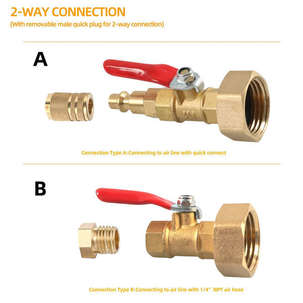 5. Easy to operate: screw the water pipe to the female thread side and connect the quick plug to the quick coupling onside the air compressor line, turn on the air compressor and rotate around the ball stem to open or close and adjust the air flow rate to blow dry water from the water pipe