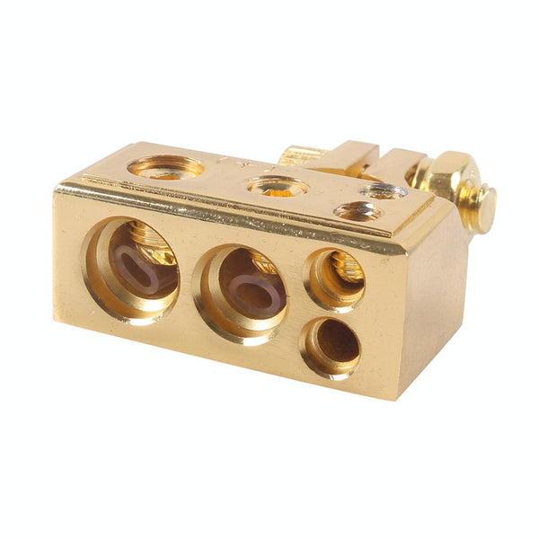 3. Accepts one 0 gauge or 2 gauge, one 4 gauge, two 8 gauge or 10 gauge connections