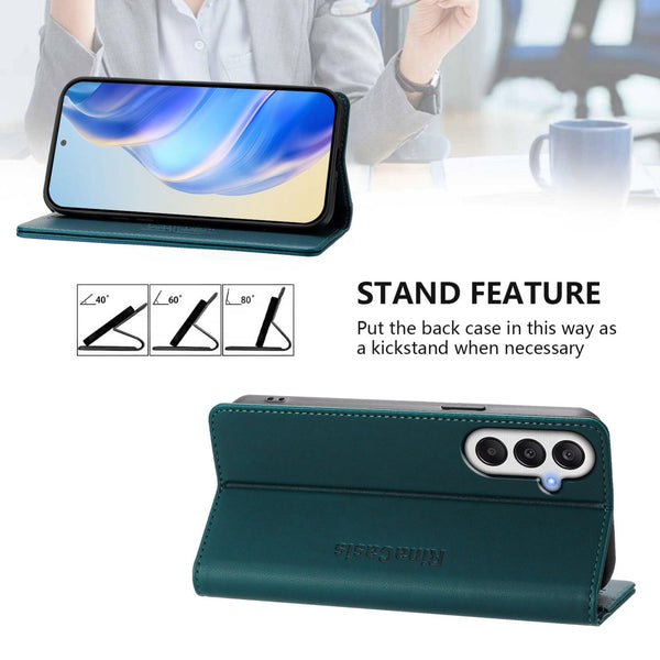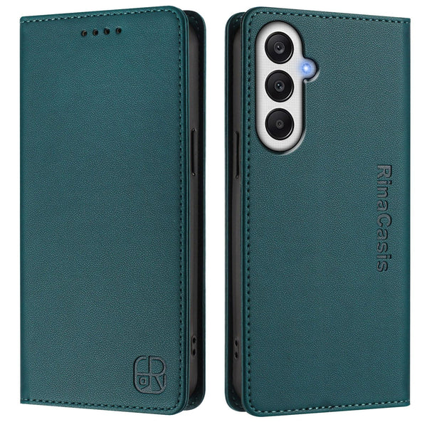 For Samsung Galaxy A25 5G Global RC01 Dual-Folded Magnetic Suction RFID Leather Phone Case(Dark Green)