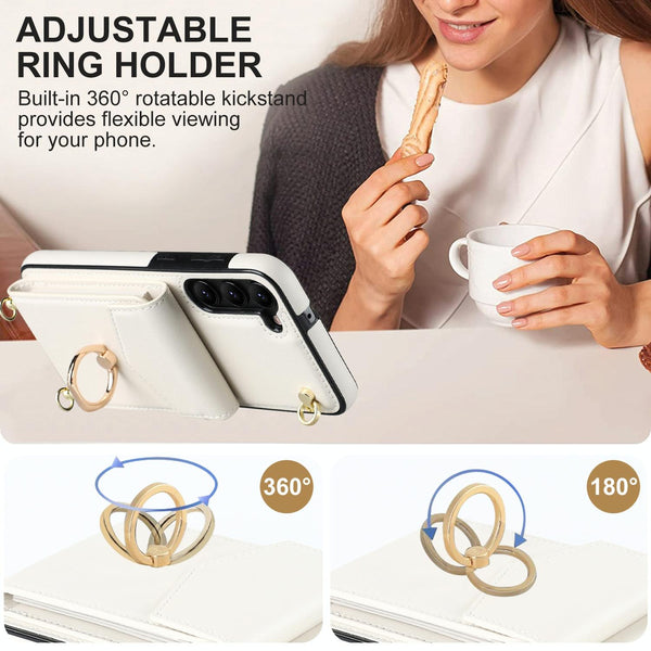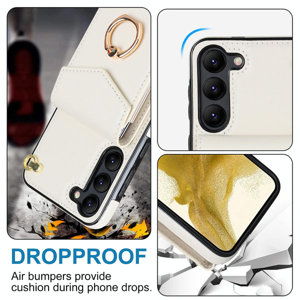 For Samsung Galaxy S22 5G Ring Holder RFID Card Slot Phone Case with Long Lanyard(Beige)