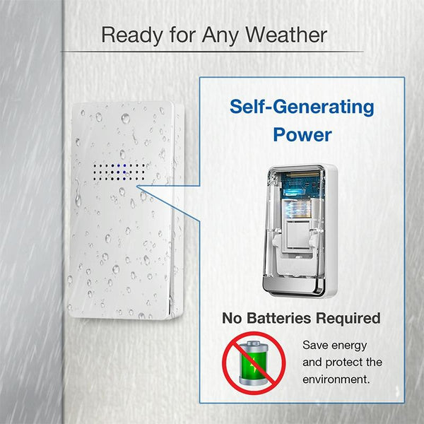 Enjoy peace of mind with this wireless doorbell, boasting a generous 150m range and integrated temperature display. Effortlessly install this self-powered doorbell, eliminating the need for batteries. The strong signal penetrates walls and floors, ensuring reliable performance throughout your home. Choose from 38 pleasant-sounding ringtones and adjust the volume to four different levels, audible even in the kitchen or on the balcony. The weatherproof design withstands rain and ensures long-lasting durability. The receiver's built-in temperature display provides convenient, at-a-glance temperature readings. This versatile doorbell can also function as a pager, particularly useful for elderly relatives living independently, providing an added layer of safety and security. Crafted from durable ABS plastic, this doorbell is built to last. Operates on a 433MHz frequency and is compatible with 100-240V/50-60Hz power supplies.