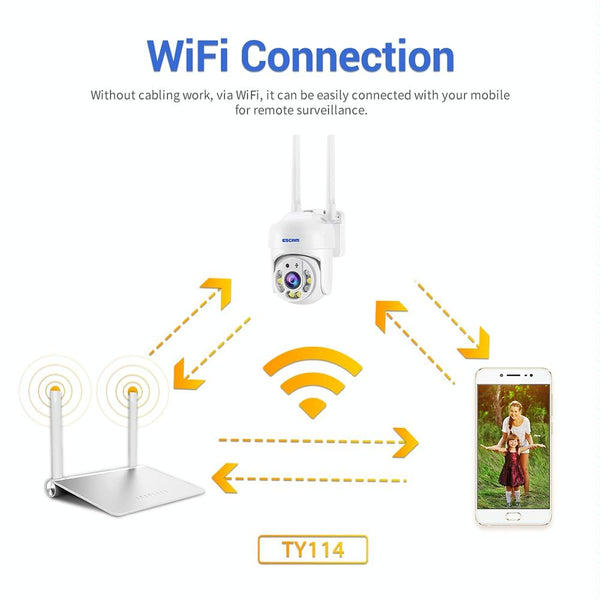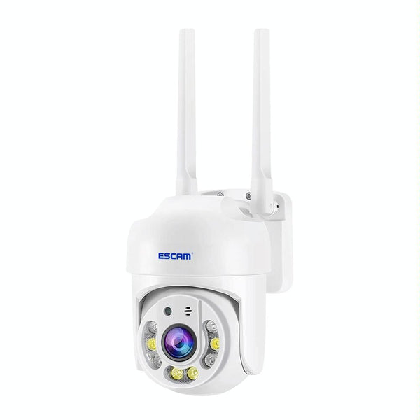 Secure your home with the ESCAM 4MP WiFi Security Camera. This outdoor IP66 rated camera boasts crystal-clear 4MP (2560x1440) resolution with H.265 compression for detailed recordings. Experience superior night vision up to 20m with 4 infrared and 4 white light LEDs, providing full-colour night vision even in darkness. Smart features include motion detection with real-time alerts, two-way audio, remote viewing and control, and automatic tracking. Store footage securely with cloud storage or a local TF card (up to 128GB). Enjoy comprehensive coverage with 355° horizontal and 90° vertical rotation. Built for all weather conditions, the IP66 waterproof rating ensures reliable performance come rain or shine. Control and view your camera through the Tuya Smart or Smart Life app. Powered by a 5V 2A power supply (included). Compatible with IEEE 802.11b/g/n WiFi. Operating temperature: -10°C to 55°C.