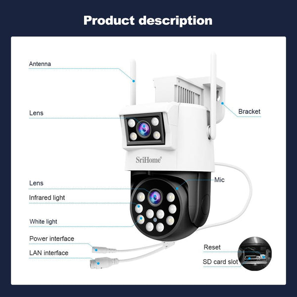 Secure your home with the SriHome SH048 Dual Lens 2MP IP Camera, featuring colour night vision and advanced AI. This dual-lens camera provides comprehensive surveillance, eliminating blind spots with its multi-angle monitoring capabilities. Capture crucial details in full 1080p HD resolution, powered by two high-speed processors and H.264 compression. Benefit from intelligent AI features like humanoid tracking and motion detection, receiving instant alerts directly to your mobile phone. Communicate clearly with built-in two-way audio, and experience superior night vision with intelligent dual light sources ensuring vivid colour images even in darkness. Enjoy flexible connectivity with AP hotspot mode for monitoring without a network connection, and store recordings locally on a microSD card (up to 128GB) or access them remotely via your mobile device (Android and iOS compatible). Built to withstand harsh weather conditions, the SH048 boasts an IP66 waterproof rating. Includes power adapter, instructions, and screw pack.