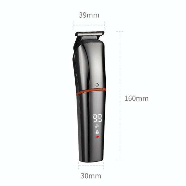 Product accessories: body + barber head x1 + finishing head x1 + shaving head x1 + nose hair head x1 + carving head x1 + temple head x1 + USB data cable x1 + English manual x1 + cleaning brush x1 + 4x limit comb + base x1