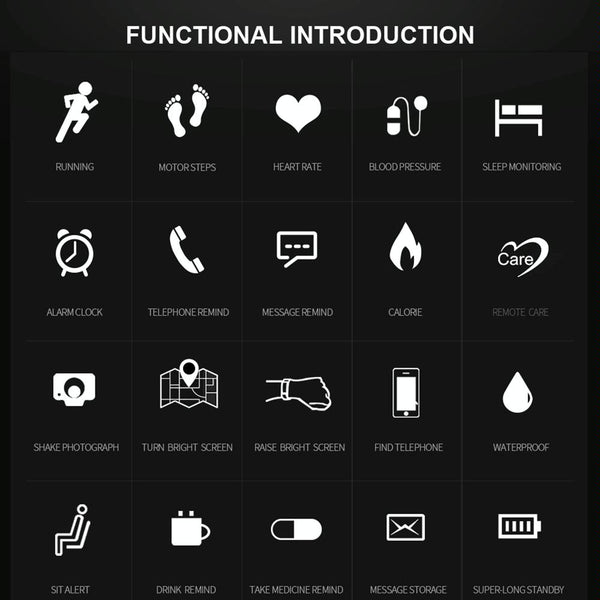 10. Main features: continuous heart rate test, remote care, pedometer, calories, distance, sleep monitoring, call reminder, alarm reminder, hand-on bright screen, social sharing (WeChat, QQ, Facebook, Twitter), shake hand to take phonto, etc.
