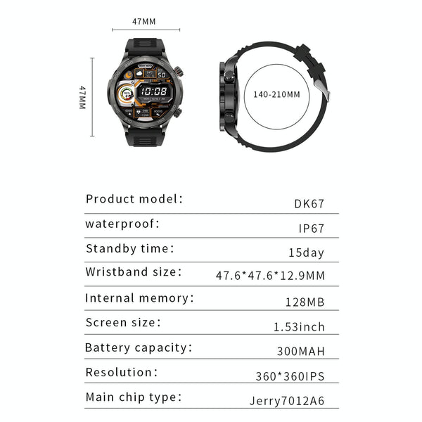 DK67 1.53 inch IP67 BT 5.0 Fitness Sport Smart Watch, Support Bluetooth Call / Sleep / Blood Oxygen / Heart Rate / Blood Pressure Health Monitor(Orange)