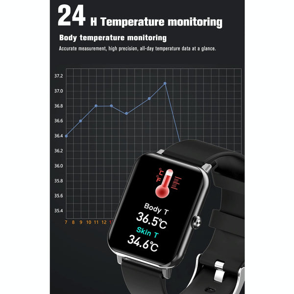 16. Functions: body temperature monitoring, sleep monitoring, heart rate monitoring, blood pressure, blood oxygen, pedometer, distance, calories, stopwatch, multi-sports mode (running, cycling, swimming, mountain climbing), call reminder, information reminder, alarm clock reminder, Sedentary reminder, reminder to drink water, reminder to drink medicine, remote camera, etc.
