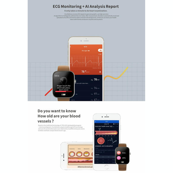 11. Functions: step counting, calories, distance, sedentary reminder, multiple exercise modes, static heart rate, dynamic heart rate, 24-hour heart rate monitoring, heart rate off-hand detection, sleep monitoring, ECG monitoring, blood pressure monitoring, body temperature monitoring, messages Push, message storage, time/date display, custom dial, etc.