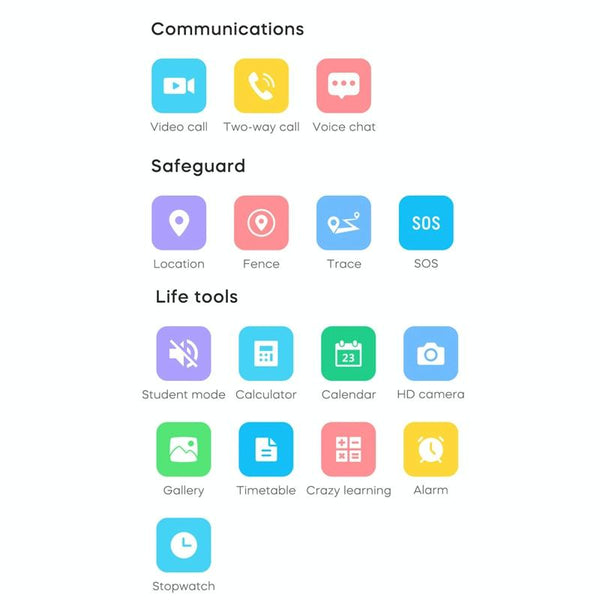 5. More functions: voice chat/album/stopwatch/alarm clock/class mode/calculator/calendar/SOS/travel track/multi-positioning/safe area