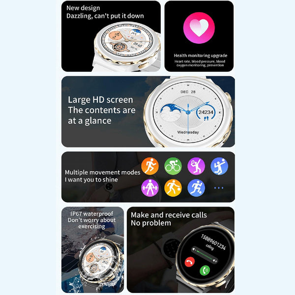 12. Main Functions: Bluetooth call, step counting, distance, calorie, heart rate/blood pressure/blood oxygen monitoring, sleep monitoring, call reminder, SMS reminder, social app message reminder, alarm reminder, sedentary reminder, multiple sports modes, wrist-raise to wake the screen, find phone, reject calls, do not disturb mode, multiple watch faces, 5 sets of UI, time setting, date setting, dual-mode switch, button announcement, phonebook, weather broadcast, stopwatch, music control, step analysis, remote photo capture, support WeChat, QQ, Facebook, Twitter, Line, Whatsapp, Instagram.