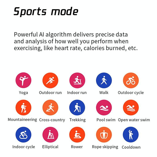18. Functions: heart rate, blood pressure, blood oxygen, sleep monitoring, mett test, breathing training, stress test, health data recording, step counting, calories, distance, support for multiple sports (biking, swimming, running, mountaineering, and walking ) 13 kinds of sports, message reminder, call reminder, text message reminder, sedentary reminder, drinking reminder, weather, calculator, stopwatch, countdown, alarm clock, shake photo, music control, password lock screen, family health sharing, Bluetooth Calls, local music playback, body temperature monitoring, connection to ears to listen to music, etc.