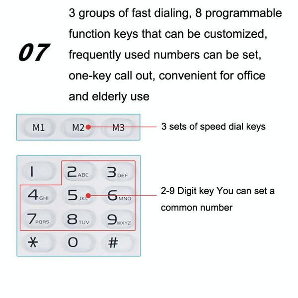 10. 3 groups of fast dialing, 8 programmable function keys that can be customized, frequently used numbers can be set, one-key call out, convenient for office and elderly use