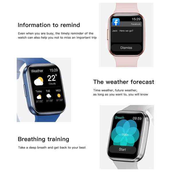 5. All-day activities and practical functions: When exercising, automatically record daily steps, distance counter, calories burned, activity minutes, etc. In addition, it also has other functions such as remote camera, music control, weather forecast, sedentary reminder, GPS tracking, stopwatch, find phone, find watch, alarm clock, etc. to serve as your effective daily assistant.