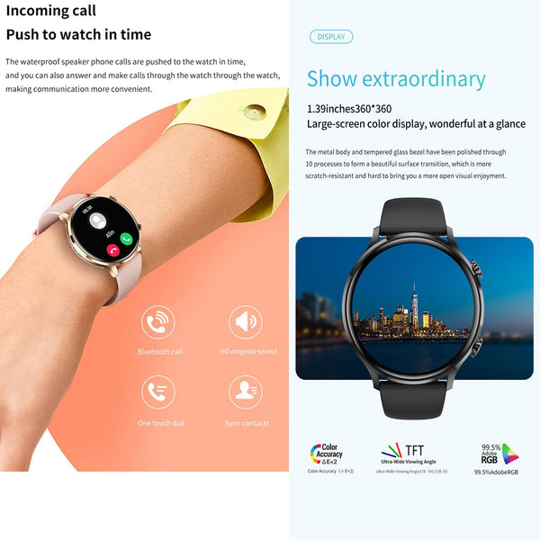 2. Basic functions: breathing training, respiration rate, female menstrual cycle, state, Audio, call records, incoming call/answer/rejection, music, message push, alarm clock, Turn your wrist to brighten the screen, backhand screen off, Do Not Disturb Mode, Shake to take a photo, find phone, Step count, countdown, stopwatch