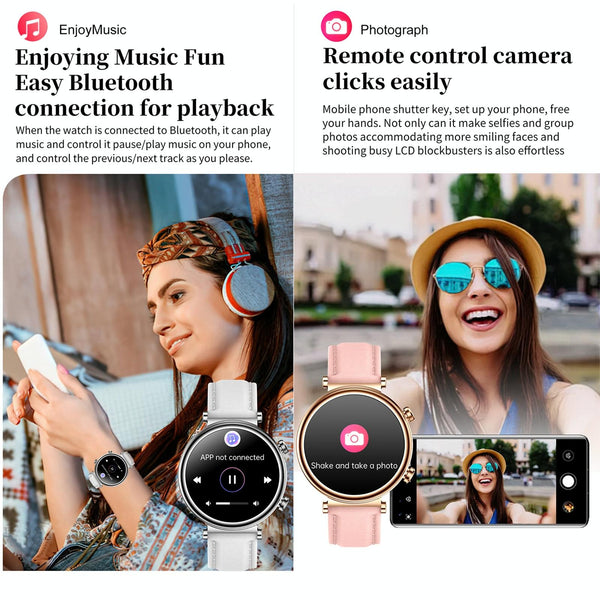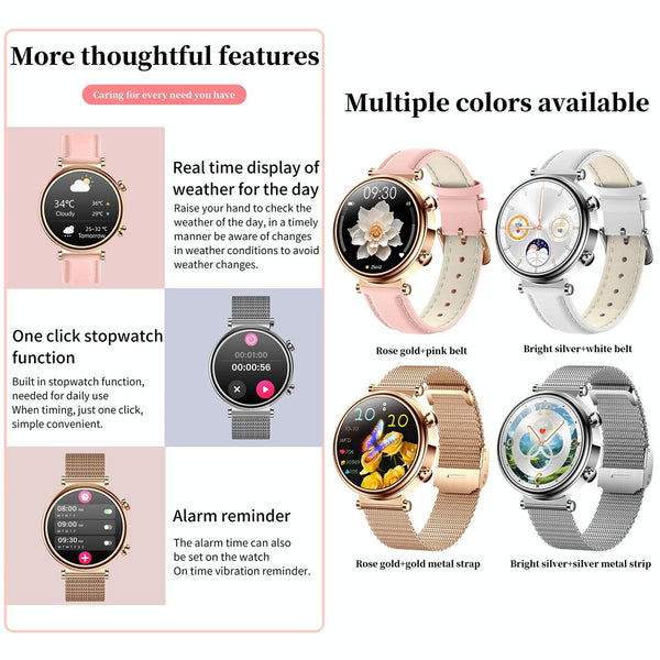 1. Function points: 40mm diameter female gold size, Bluetooth communication, female health (physiological cycle function), non-invasive blood glucose measurement, uric acid measurement, blood lipid monitoring, SOS emergency call function, temperature monitoring, blood oxygen monitoring, respiratory training, heart rate monitoring, blood pressure monitoring, sleep monitoring, sedentary reminder and other health functions, intelligent voice assistant, remote family and friend care function, weather forecast.