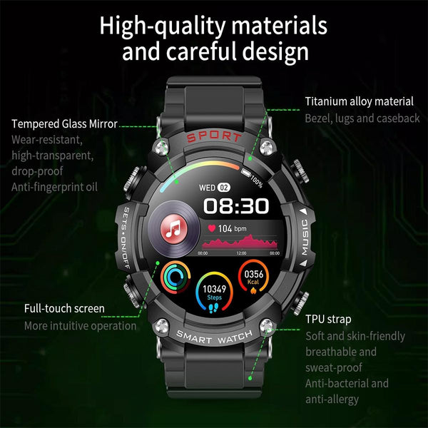5. Military appearance, metal craftsmanship, TPU high-end sports style strap, 1.52-inch full touch screen, mechanical button operation and dual operation