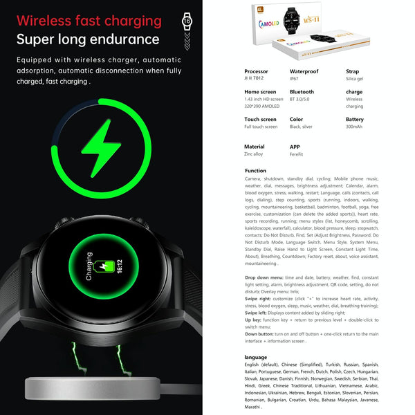 14. APP/Watch language: English (default), Chinese (Simplified), Turkish, Russian, Spanish, Italian, Portuguese, German, French, Dutch, Polish, Czech, Hungarian, Slovak, Japanese, Danish, Finnish, Norwegian, Swedish, Serbian, Thai, Hindi, Greek, Chinese (Traditional), Lithuanian, Vietnamese, Arabic, Indonesian, Ukrainian, Hebrew, Bengali, Estonian, Slovenian, Persian, Romanian, Bulgarian, Croatian, Urdu, Malay, Javanese, Marathi.