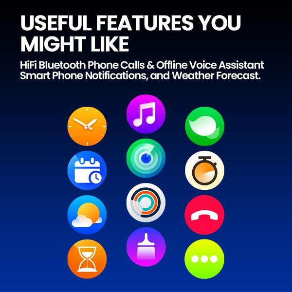 13. Daily Smart Features: Smart Notifications(Call, Text, Gmail, and Smartphone App Notifications), Weather Sync, Controls Smartphone Music and Camera, Find My Phone and Watch, Do Not Disturb Modes, Sedentary alert, Drink water reminder, Calendar, Calculator, Business Card, APP Download.