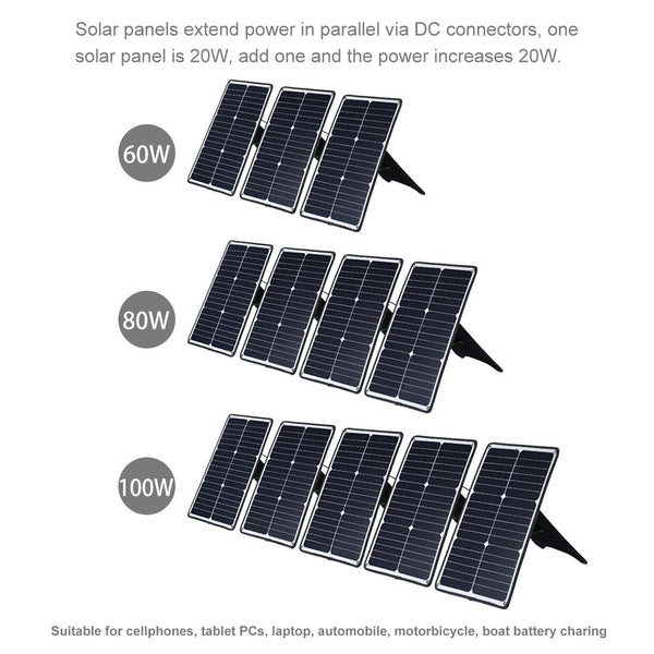 HAWEEL 4 PCS 20W Monocrystalline Silicon Solar Power Panel Charger, with USB Port & Holder & Tiger Clip, Support QC3.0 and AFC(Black)