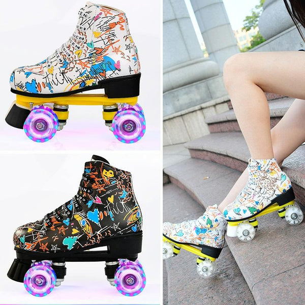Adult Children Graffiti Roller Skates Shoes Double Row Four-Wheel Roller Skates Shoes, Size: 37(Flash Wheel Black)