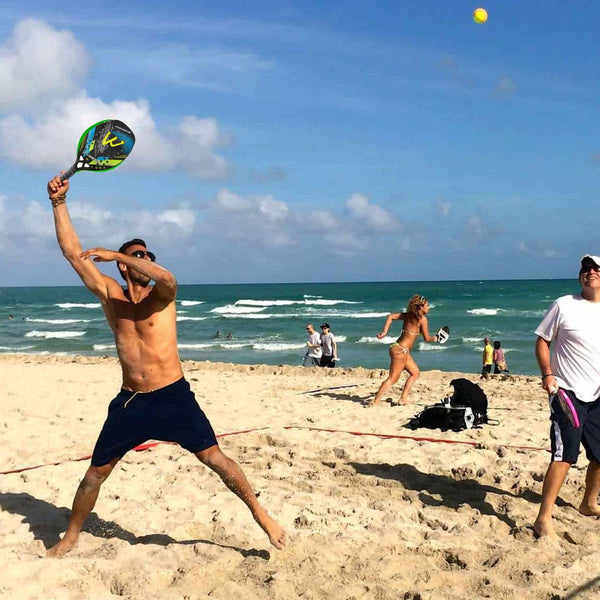 The beach tennis racket consists of a main frame, a triangle interface and a handle.