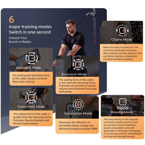 3. Provides you with 6 training modes: atandard mode, concentric mode, eccentric mode, constant mode, chain mode, and generation mode.