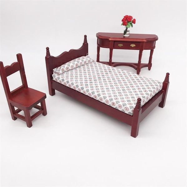 1. The mahogany-colored cot is very warm in the bedroom of the doll house.