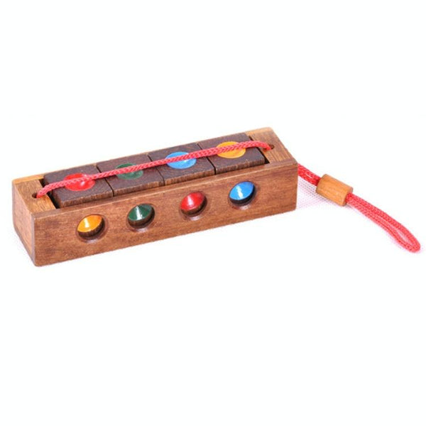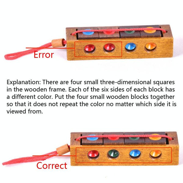 7. Description: there are four small three-dimensional squares in the wooden frame, each of which has six sides of different colors. Put the four small wooden blocks together so that they do not repeat the color no matter which side they are viewed from