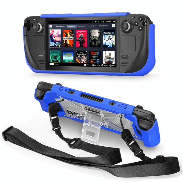 For Steam Deck Shockproof Game Console Case with Holder & Shoulder Strap(Blue+Transparent)