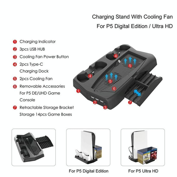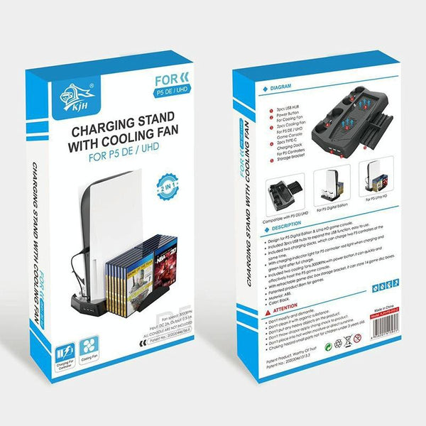 KJH P5-010-2 Multi-function Charging Cooling Fan Base with Storage Tray Bracket For PS5 De / UHD