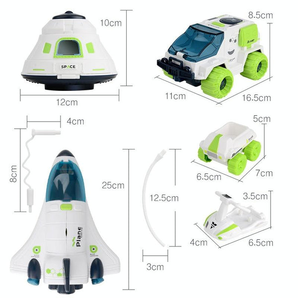 7. Dimensions: Return capsule: 12x10cm, space vehicle: 11x16.5x8.5cnm, shuttle: 20 x 25cm, space station: 11.5x24cm, rocket: 23.5x42cm