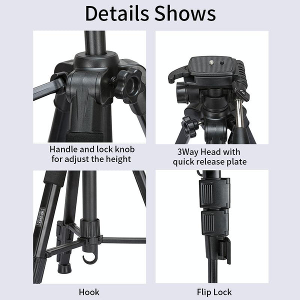 1.Standard 1/4 screw interface, the tripod is suitable for SLR cameras, mobile phones, etc.