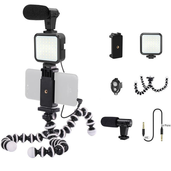 19. Packing list: tripod, microphone, fill light, mobile phone holder, mobile phone cable, manual