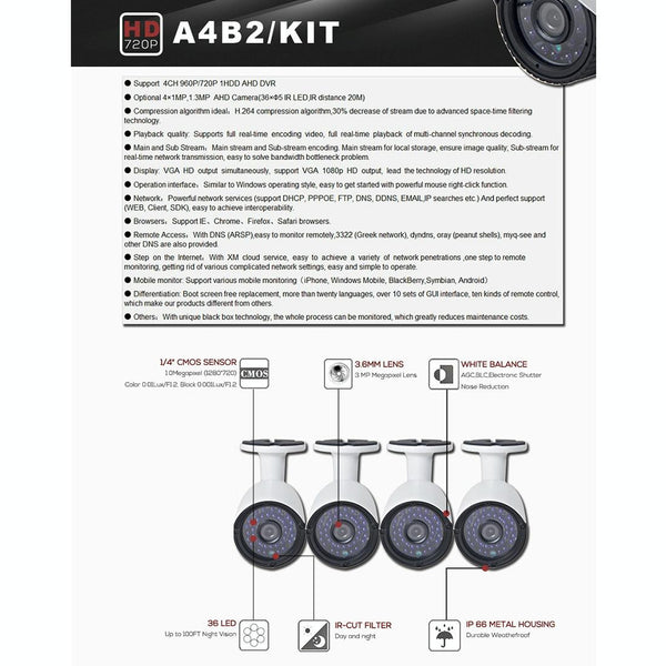 Secure your home or business with this comprehensive 4CH 1080p IP Camera NVR Kit. Enjoy peace of mind with crystal-clear 1080p resolution, providing detailed surveillance footage day and night. The kit includes four 2.0MP IP cameras, each equipped with 36 infrared LEDs for night vision up to 20 metres. Benefit from advanced H.264 compression, ensuring efficient storage without compromising video quality.